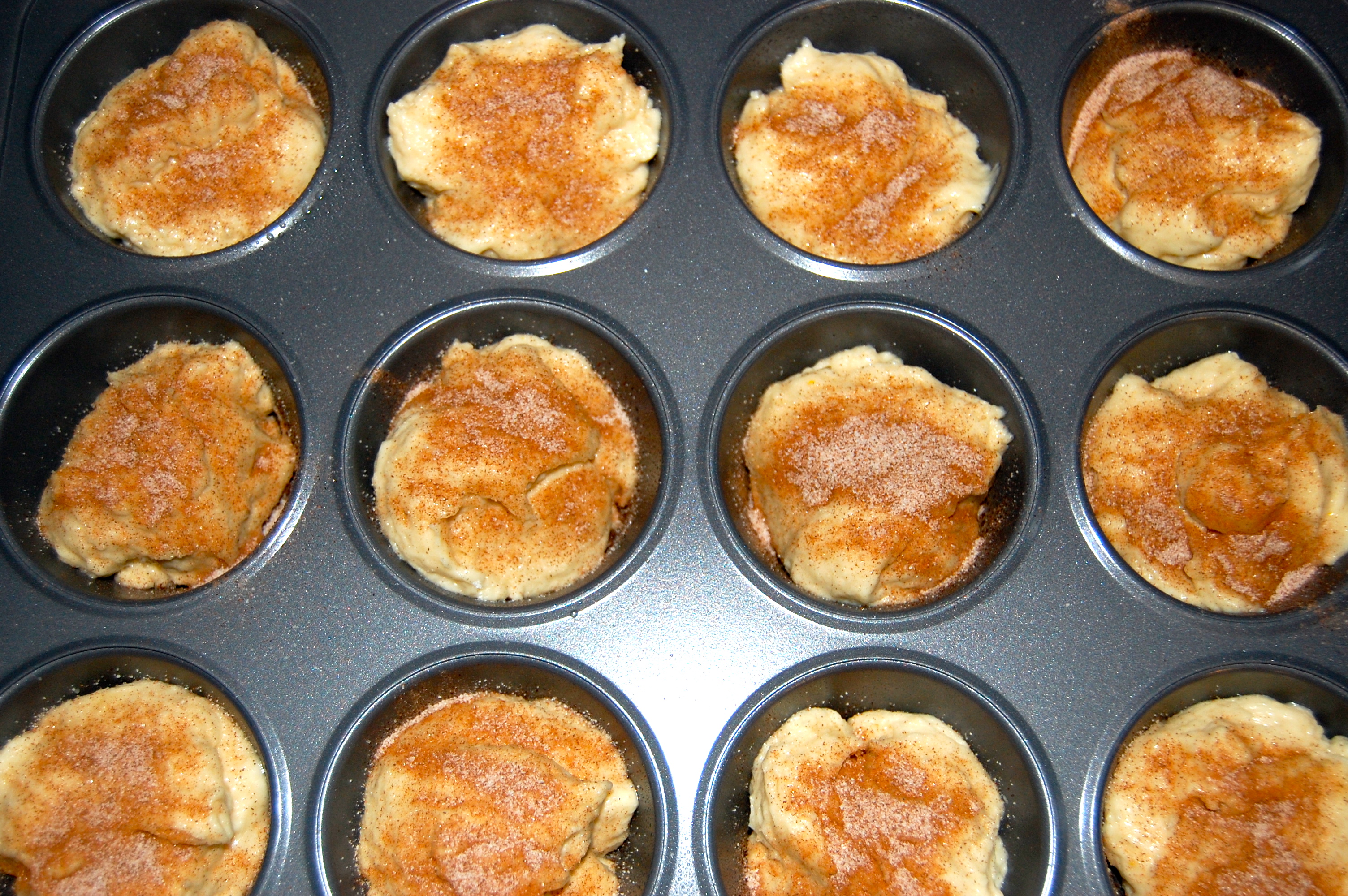 4. Combine sugar and cinnamon and sprinkle over muffin tops. Alternately, fill muffin tins part-way with batter, sprinkle cinnamon and sugar, finish filling, and sprinkle tops with cinnamon sugar.